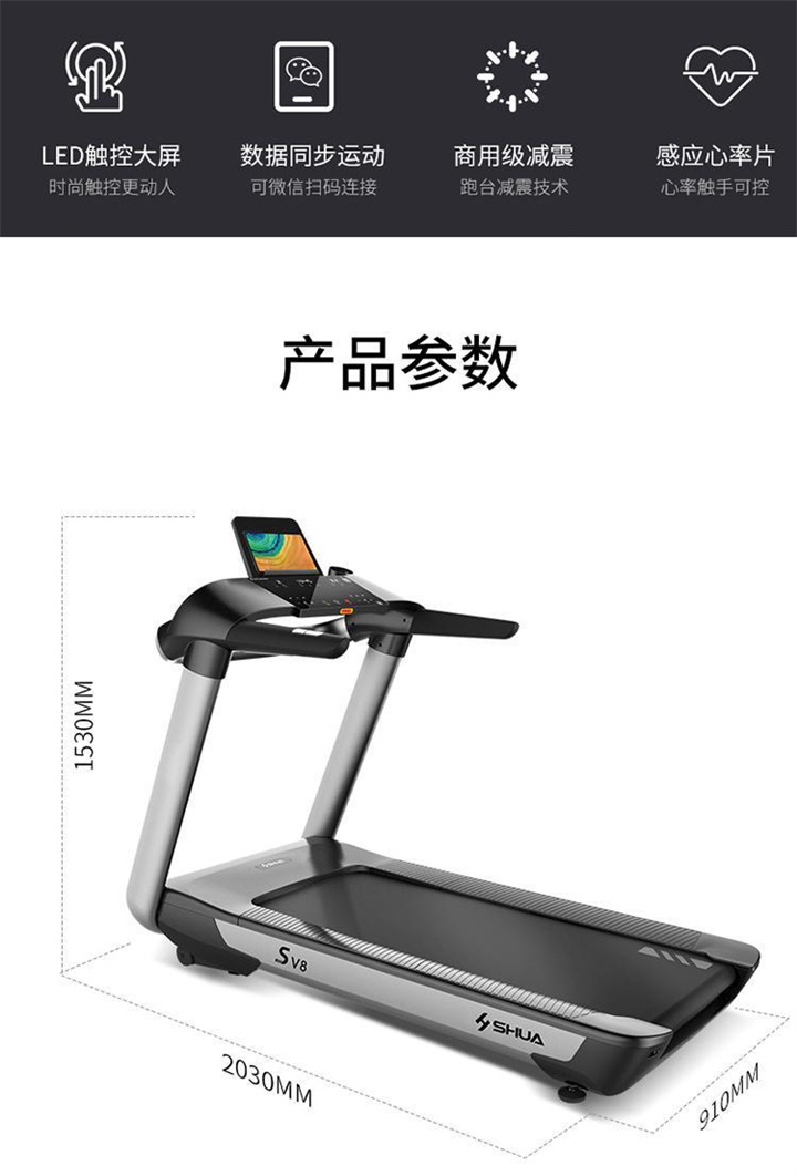 舒华商用跑步机SH-T860(V6)采用商用大跑台,手握心律测试,全跑台减震护足的设计,对您跑步中的膝盖进行全方位的呵护,选用手握式感应片测心率等数据,跑步面积达580×1570mm,可承受180kg的使用者使用。