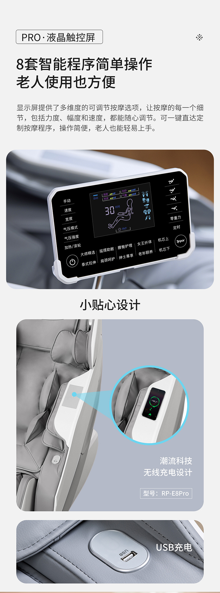 • 产品简介:锐珀尔新品按摩椅E8 Pro拥有温感养生系统,3D摆揉机械手,十大按摩手法,138cm超长SL按摩导轨,腿足一体按摩等功能,并且有无线充的一款新品按摩椅,价格不贵,重在享受。